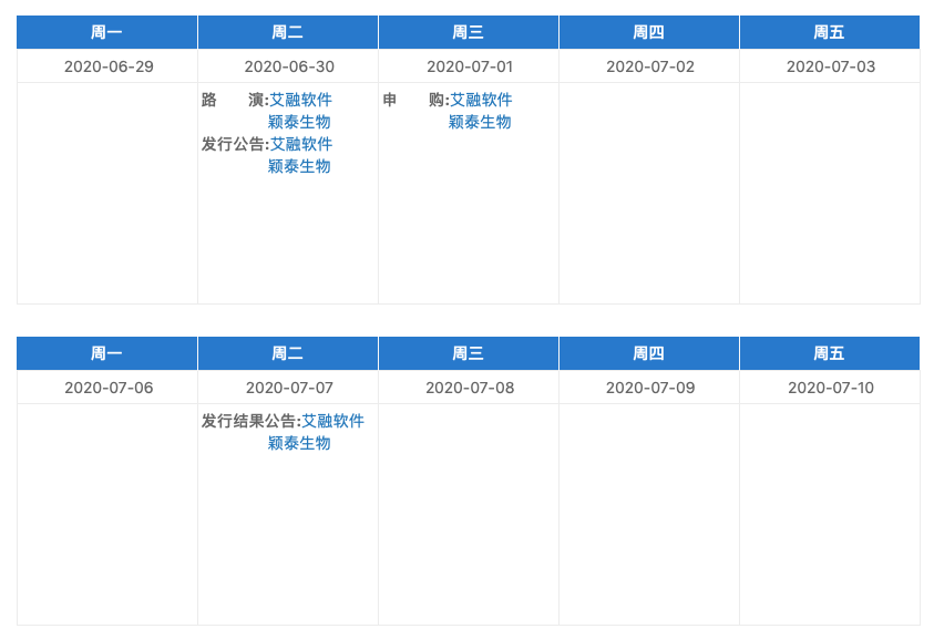据股转公司网站,颖泰生物(833819.OC)、艾融软件(830799.OC)将于7月1日申购,发行结果均将于7月7日公告,此次两家企业均采用询价发行方式,且即将发布询价公告。