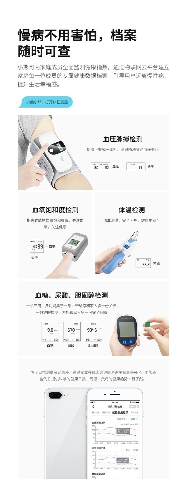 小熊药智慧箱配备的人体测量设备,实时分析体检数据,可随时观察家人的身体健康指数。使得人们在忙碌的生活工作之余,还能远程对家人进行关护,建立亲情纽带。